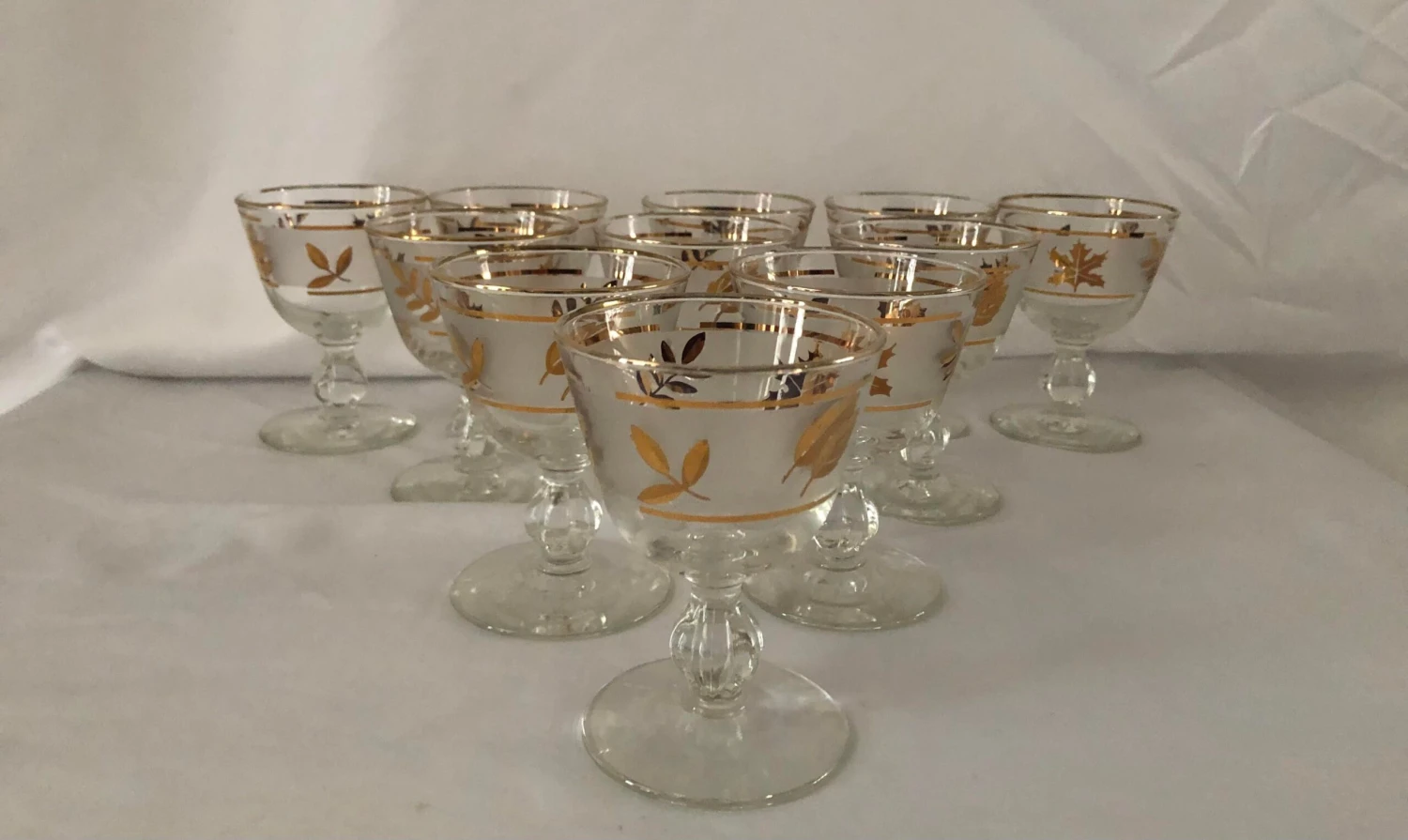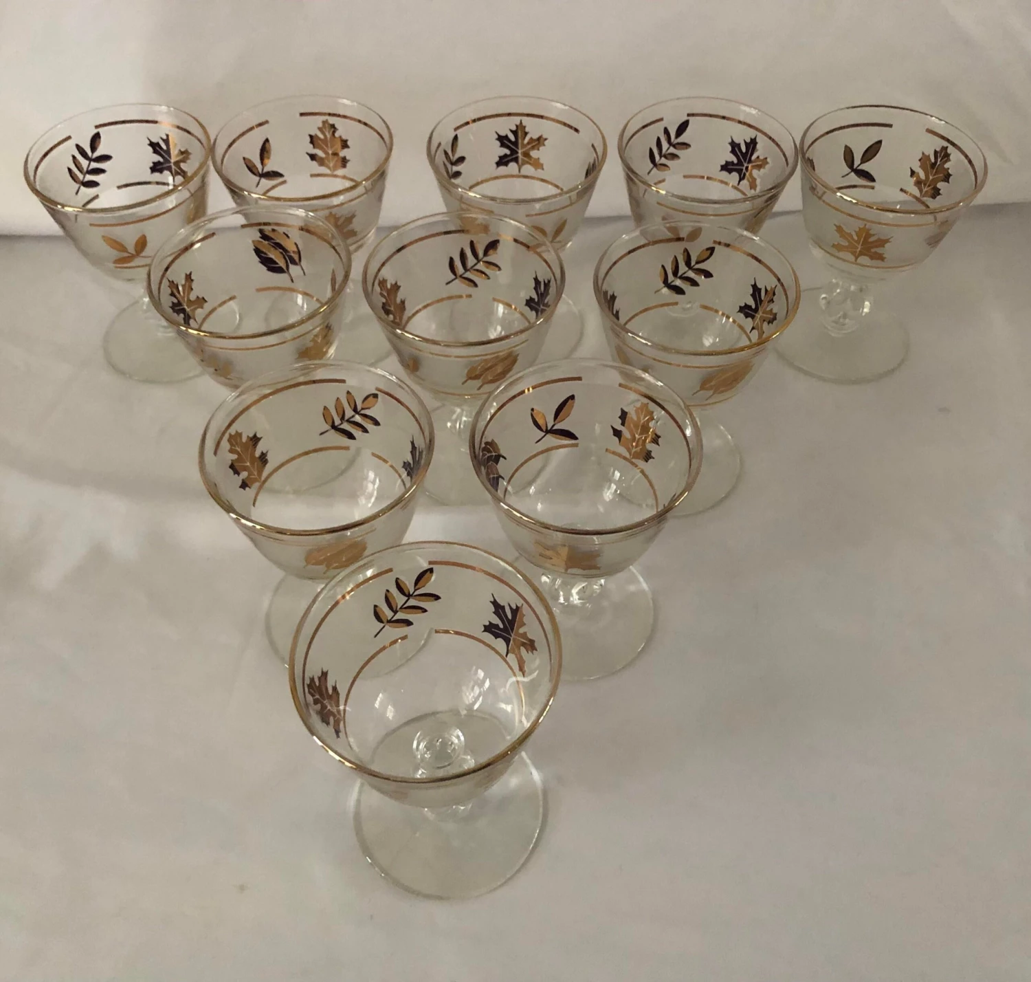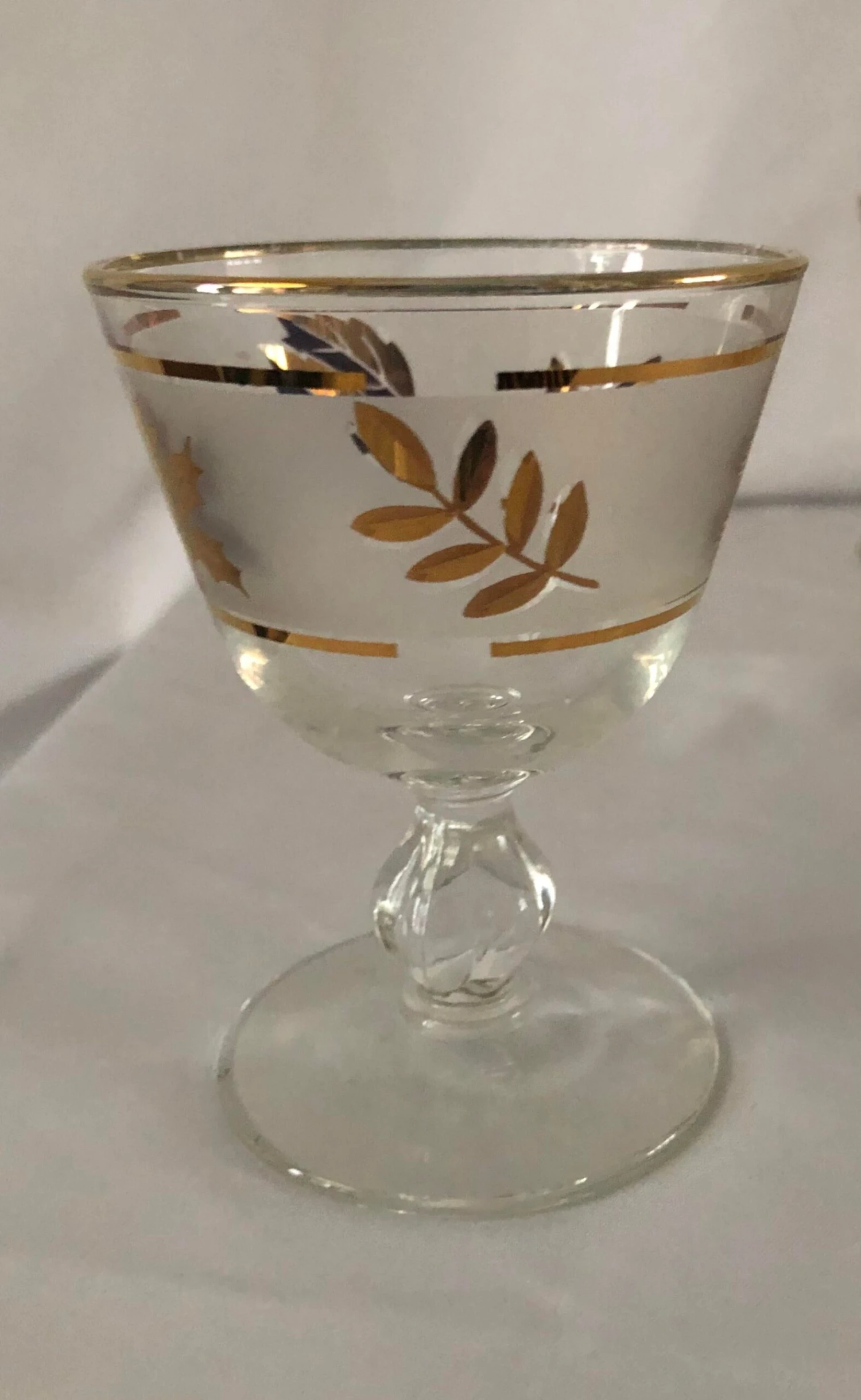 Looks to never have been used , a Mid Century set of Libbey “Golden Foilage ” wine glasses.
