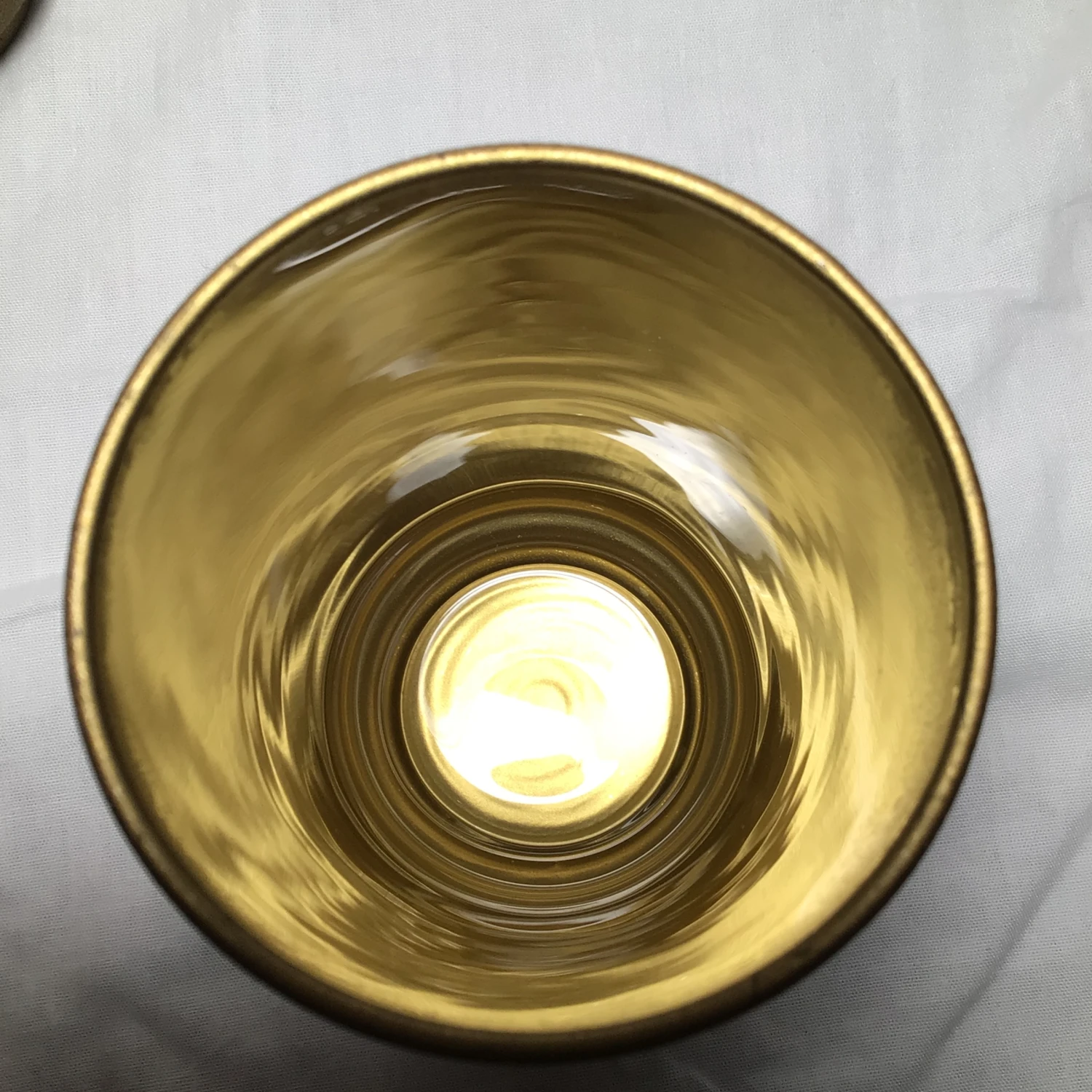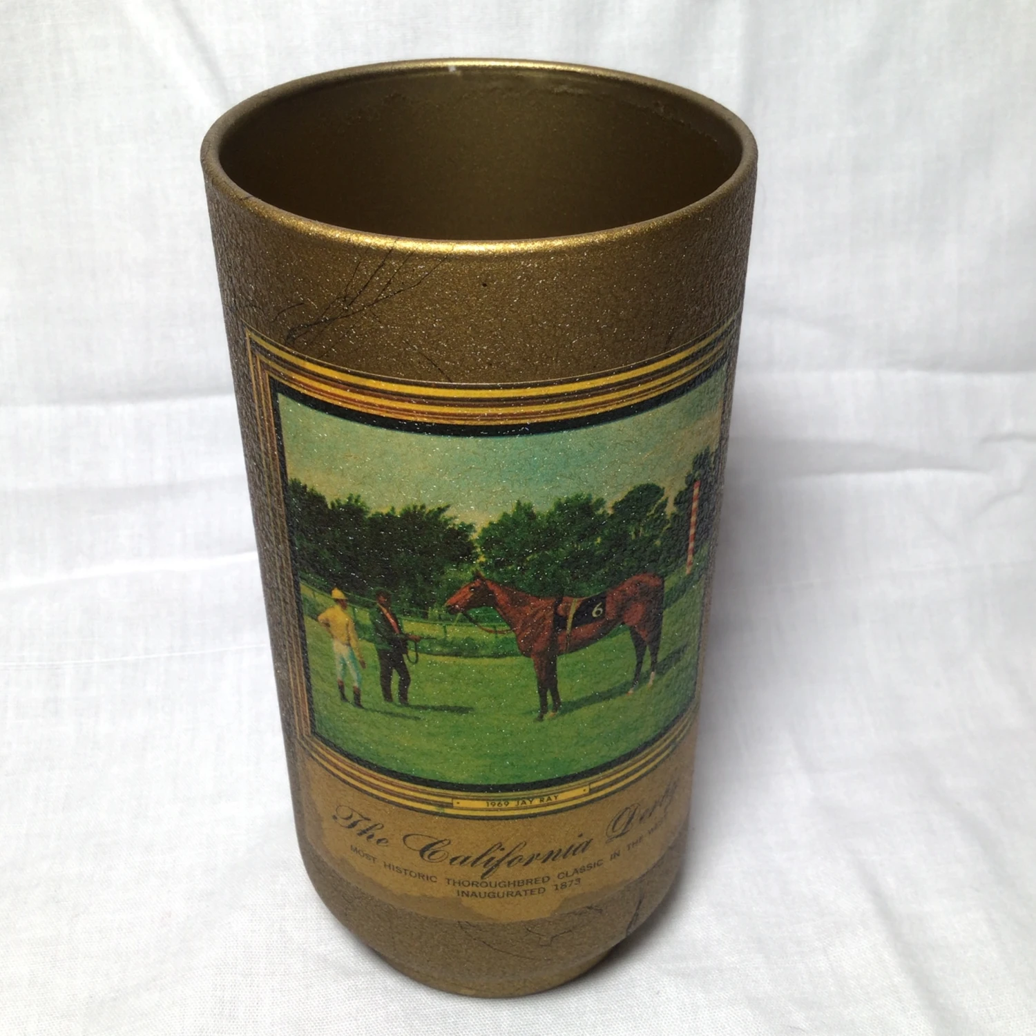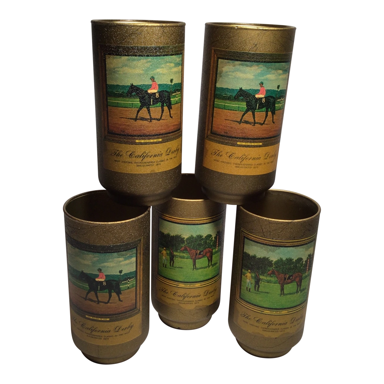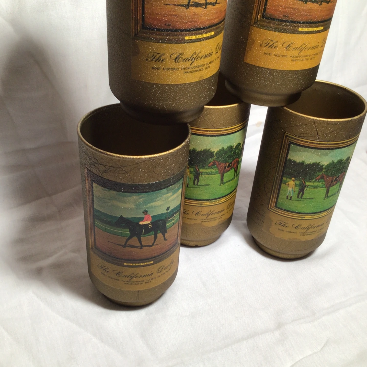 The glasses have a sparkly gold mid century look with black splatter lines. Three of the glasses feature 1967 California Derby horse “Reason to Hail” and the other two have 1969 California Derby “Jay Way”