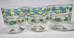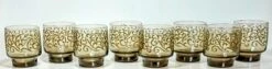 The glasses have a sparkly gold mid century look with black splatter lines. Three of the glasses feature 1967 California …