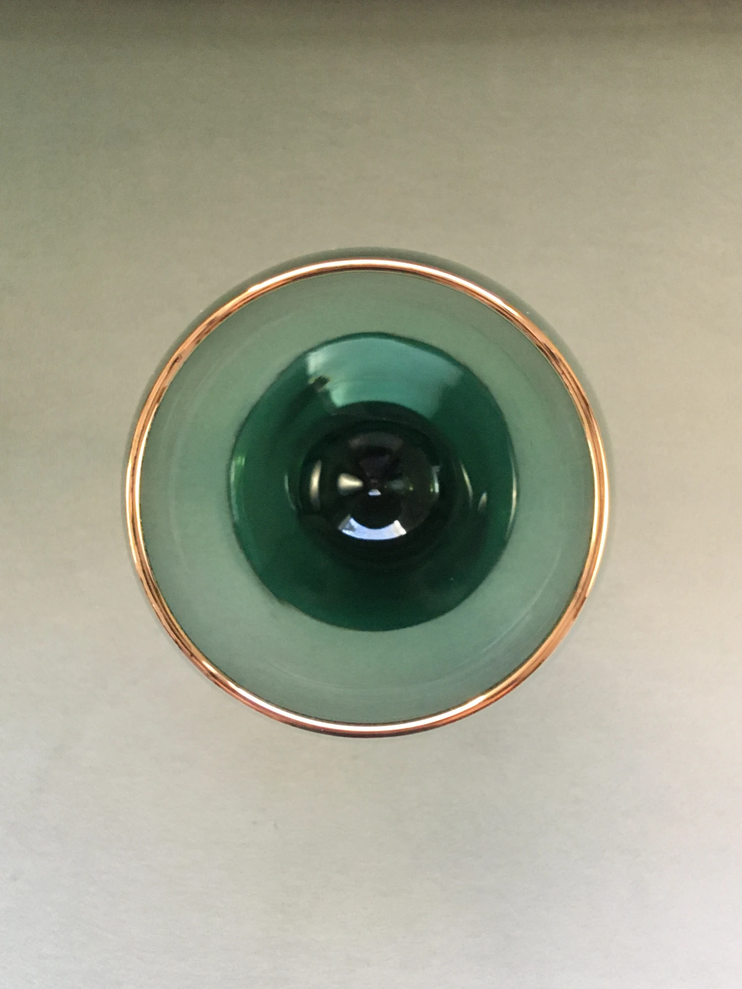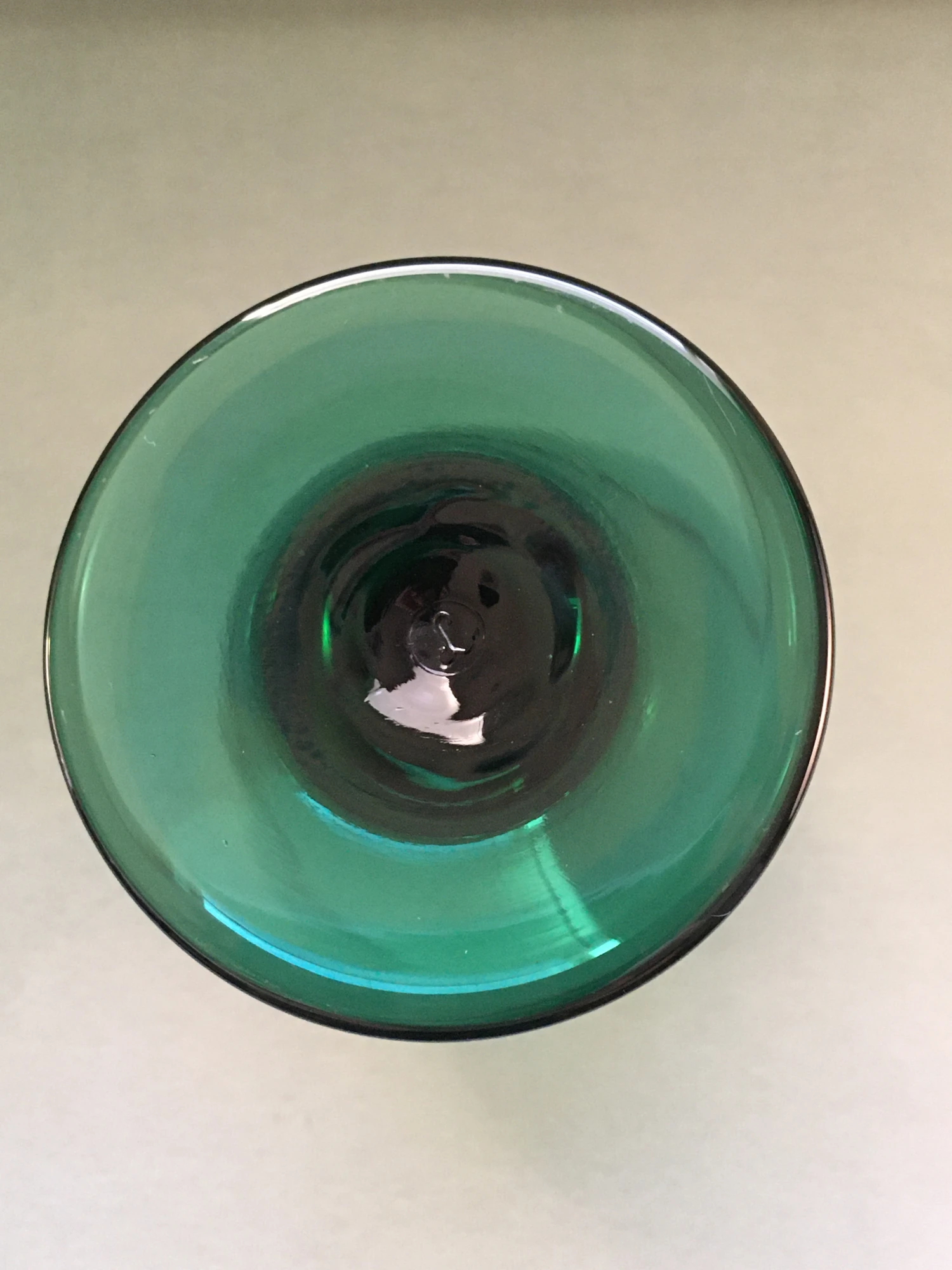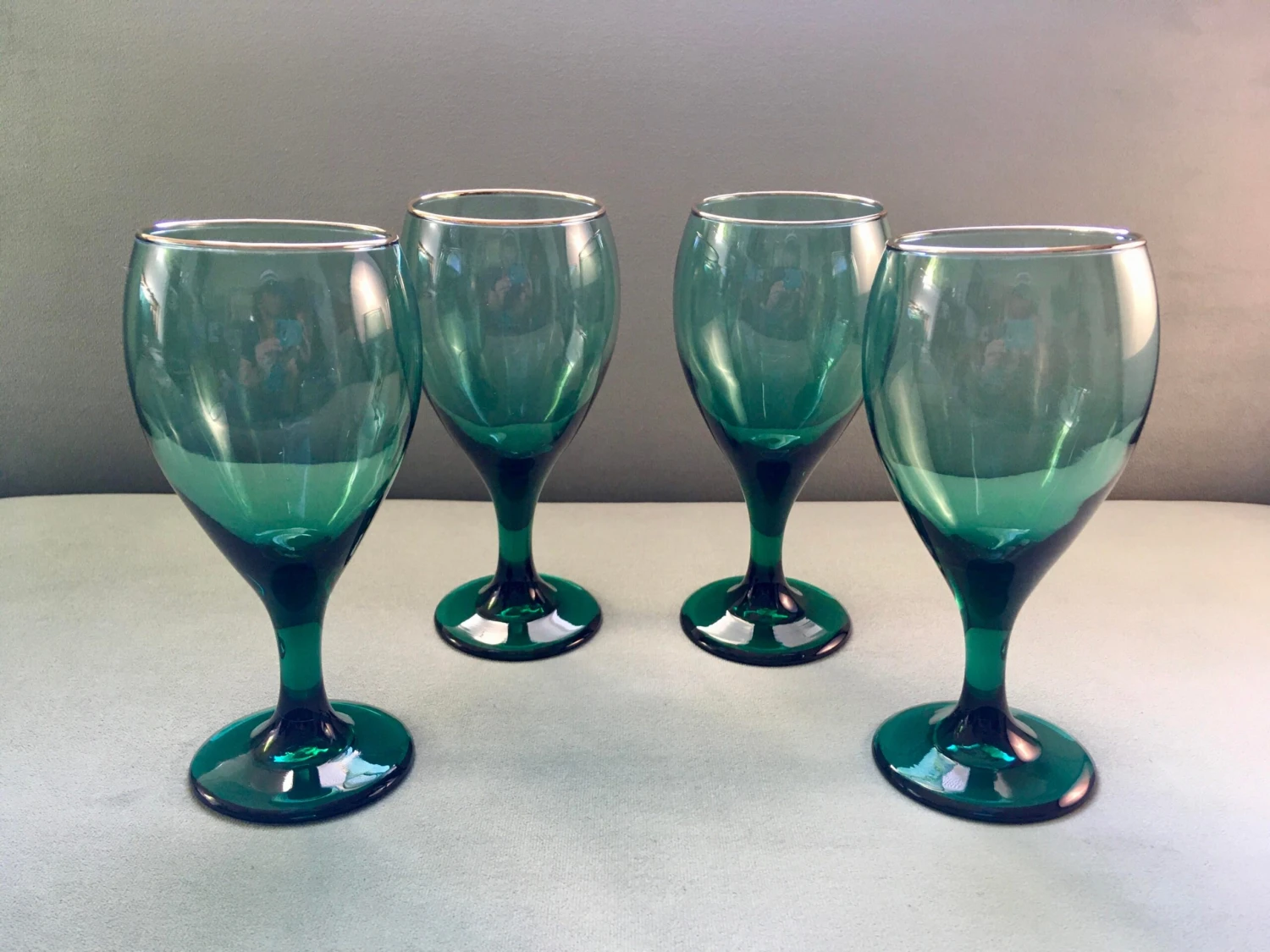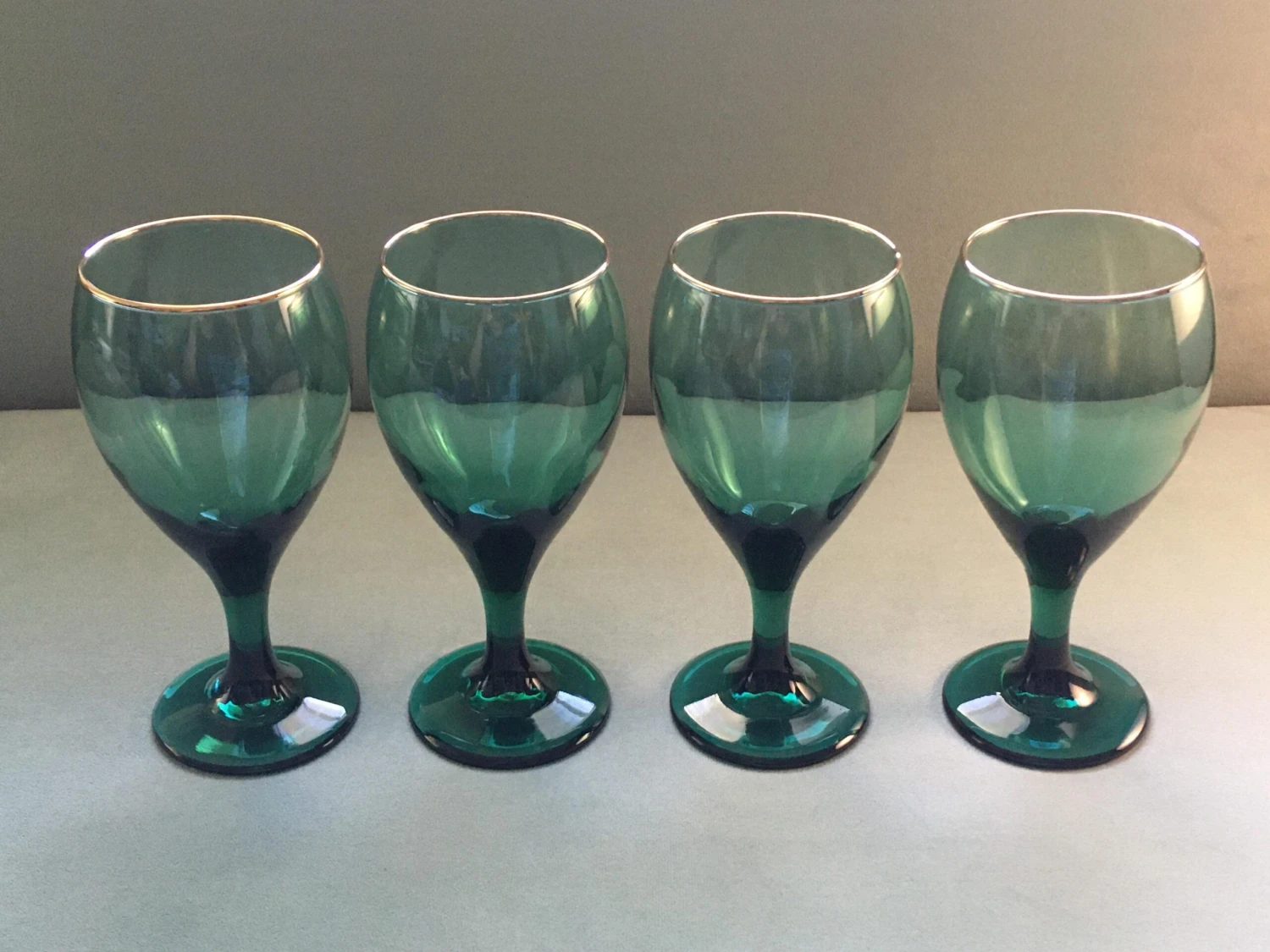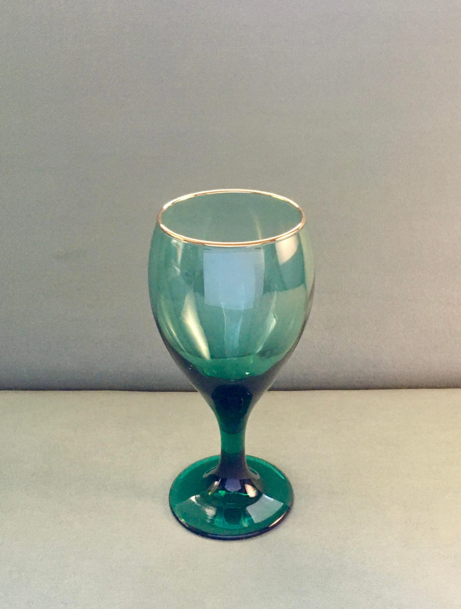 A charming green and gold set of vintage wine glasses in excellent condition.
