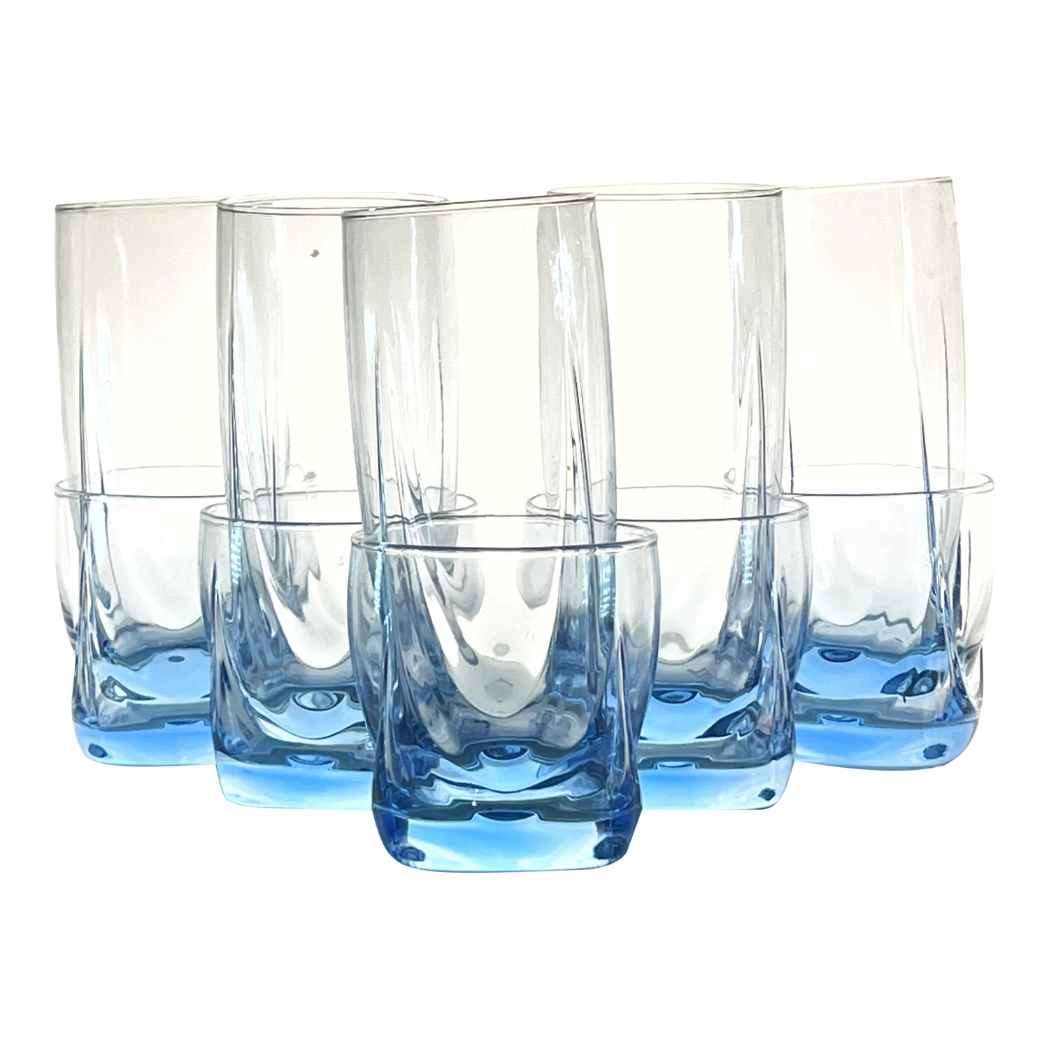 Love the fluorescent quality in these “Carrington” highball and old fashioned drinking glasses in Misty Blue. These glasses have a unique square shape with a beveled base. Produced by the Libbey Glass Company between 2005 – 2017.