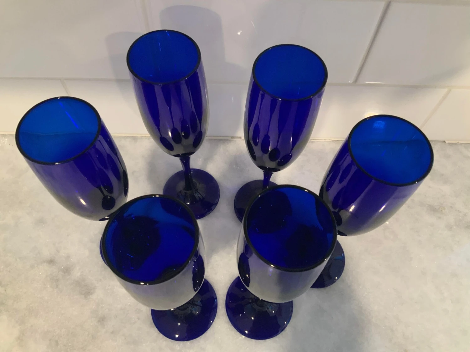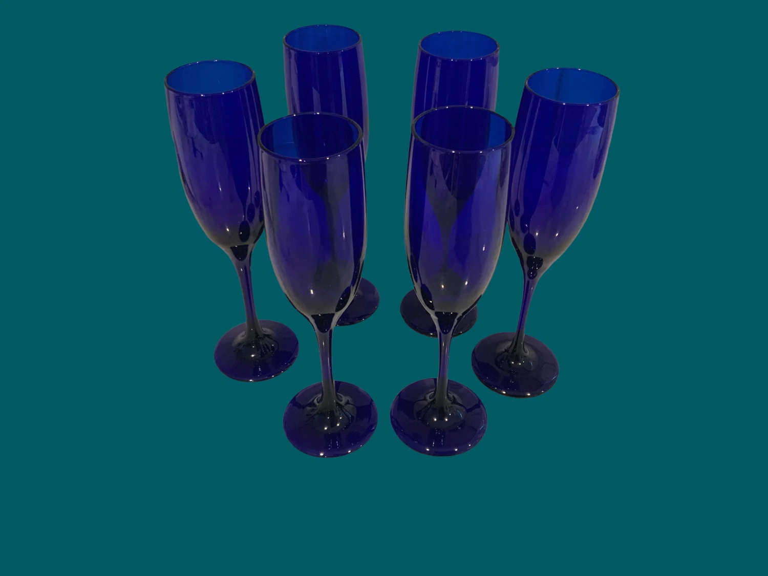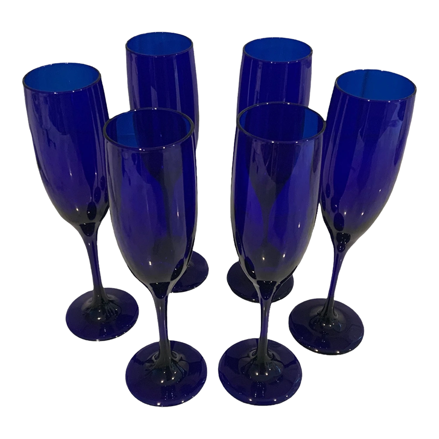 A set of 6 Libbey cobalt blue champagne flutes. Each stunner is lab,Ed with a cursive “L” on the bottom center.