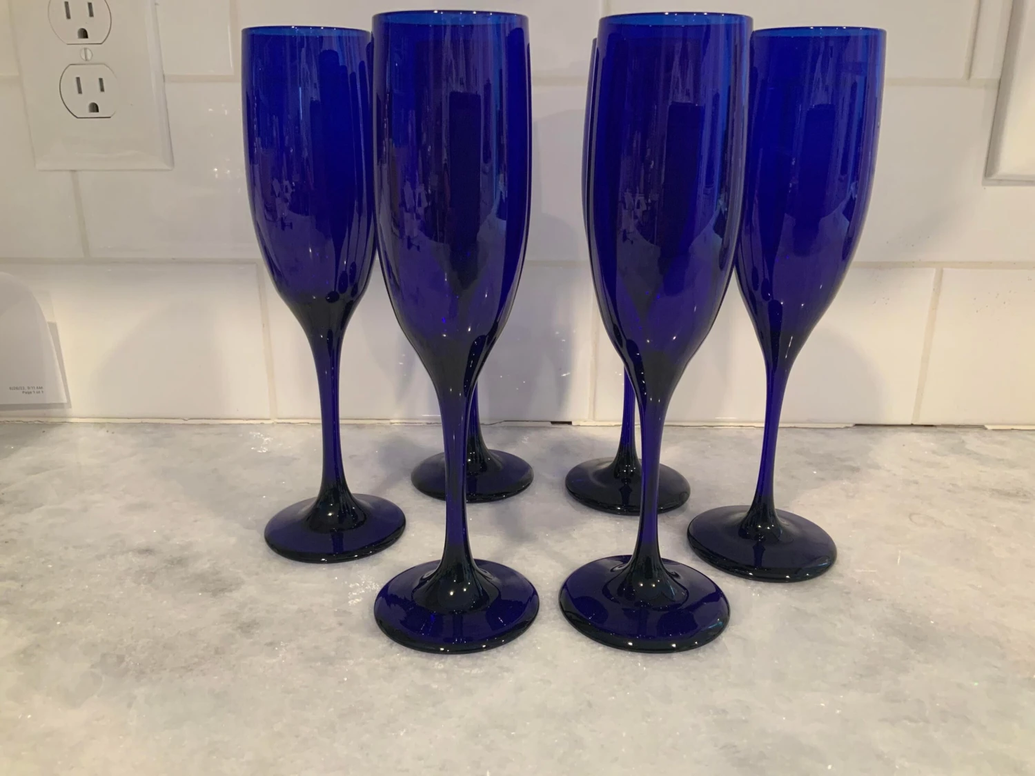 A set of 6 Libbey cobalt blue champagne flutes. Each stunner is lab,Ed with a cursive “L” on the bottom …
