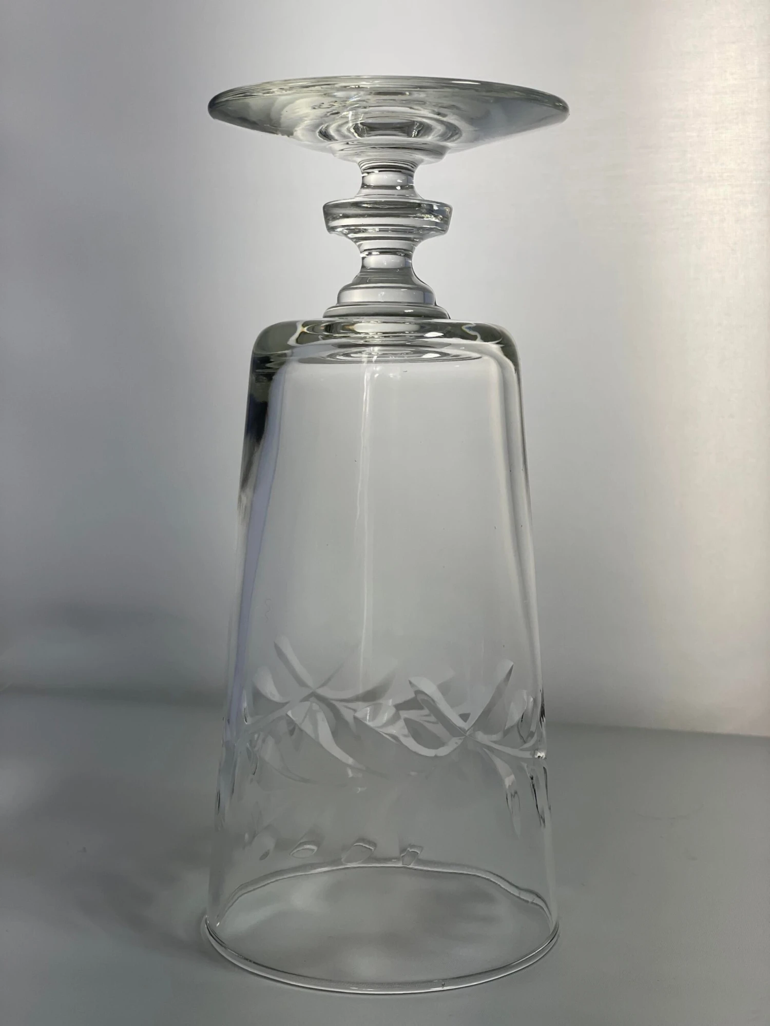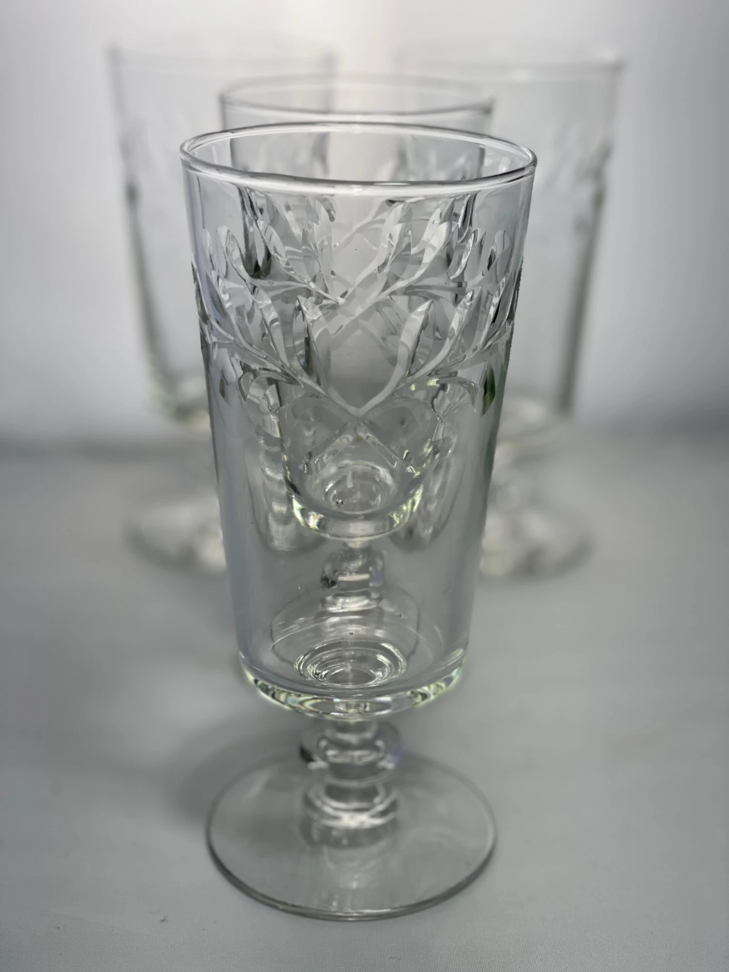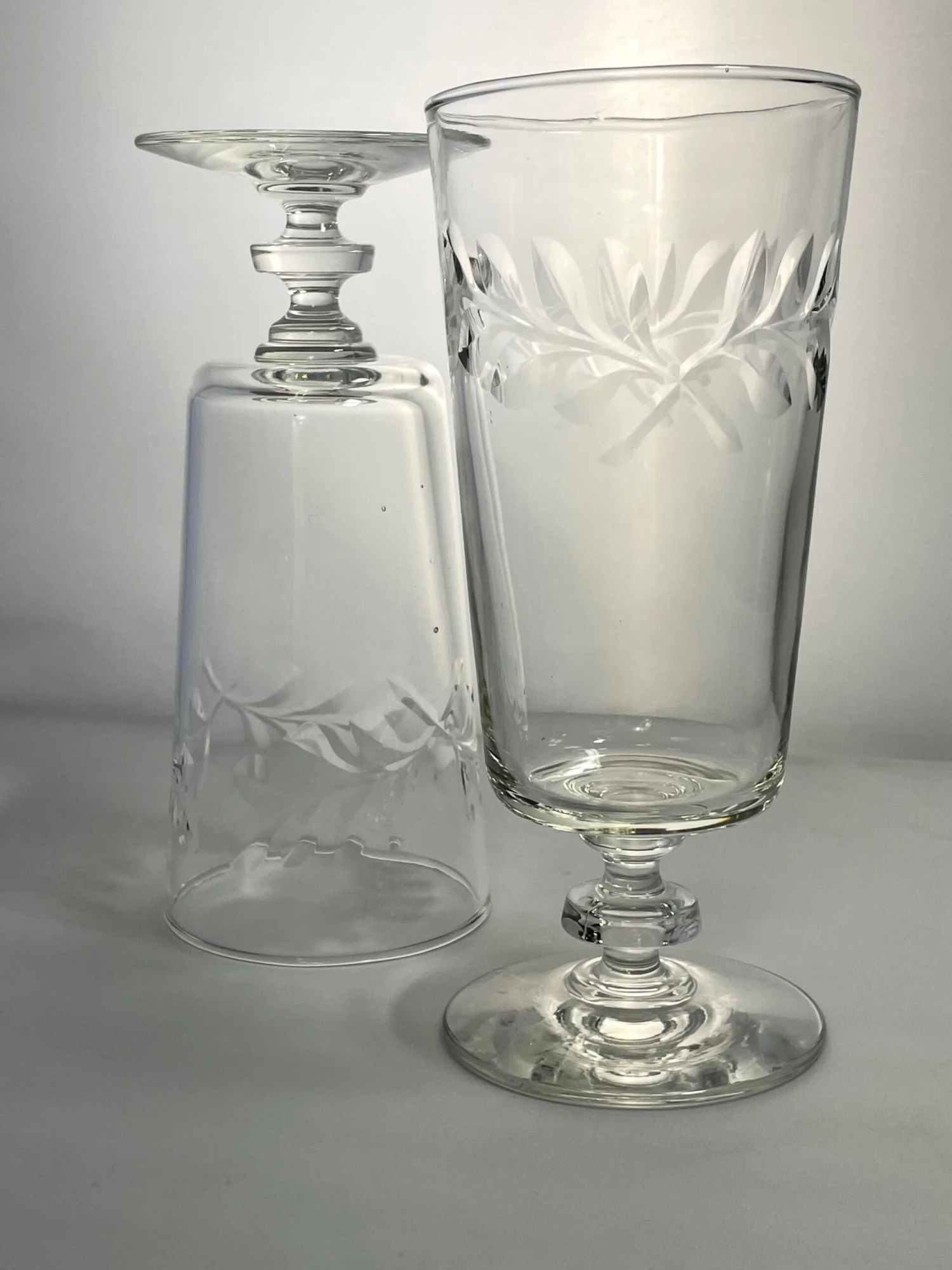 Vintage Victoria pattern ice tea glassware by Rock Sharpe (1948). Mid century design features cut leaves on a blown glass bowl with a ringed stem. Measuring 6 3/4”T X 3”W, this set is in good vintage condition with light wear consistent with age or use. Nice heavy glass. Some air bubbles noted from glass blowing process.