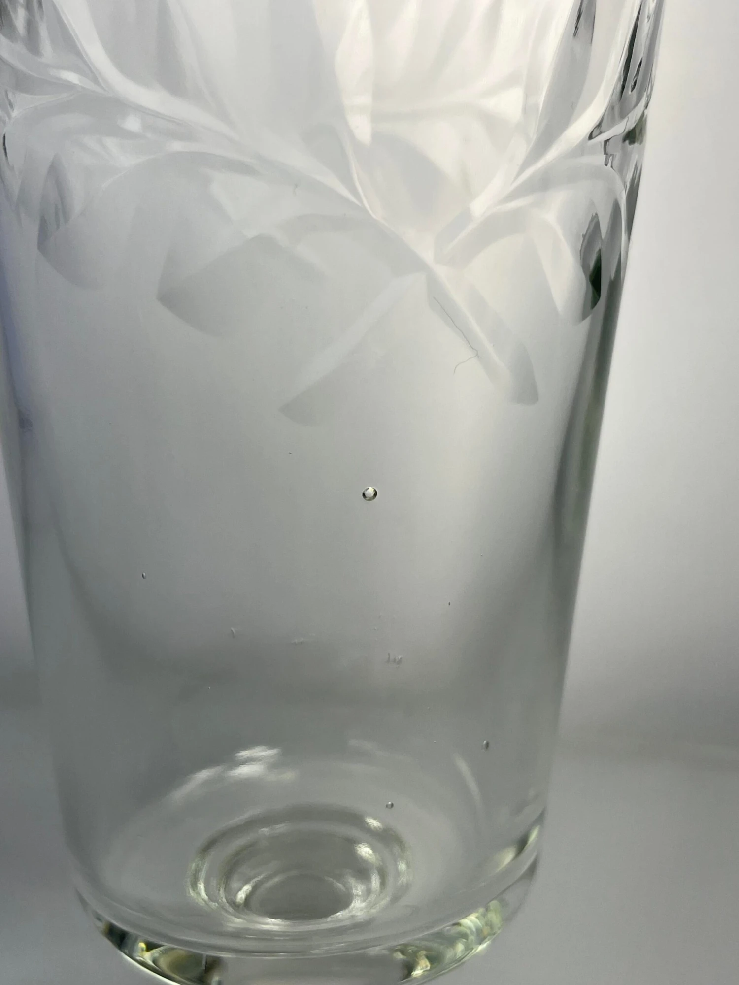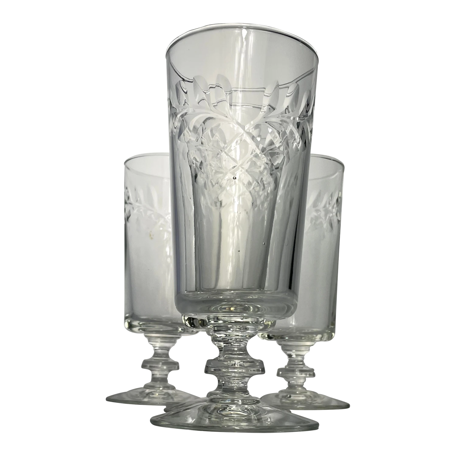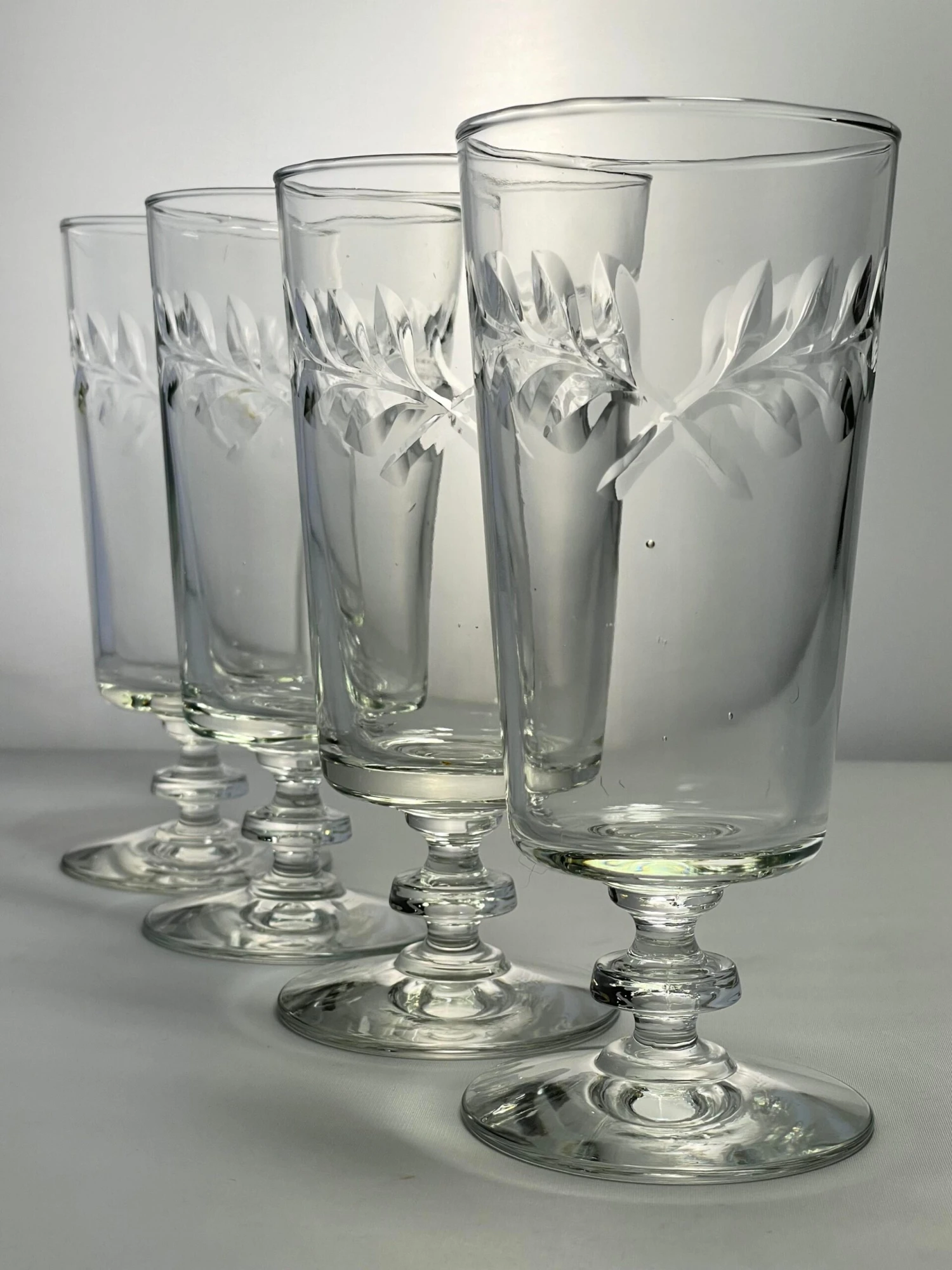 Vintage Victoria pattern ice tea glassware by Rock Sharpe (1948). Mid century design features cut leaves on a blown glass bowl with a ringed stem. Measuring 6 3/4”T X 3”W, this set is in good vintage condition with light wear consistent with age or use. Nice heavy glass. Some air bubbles noted from glass blowing process.