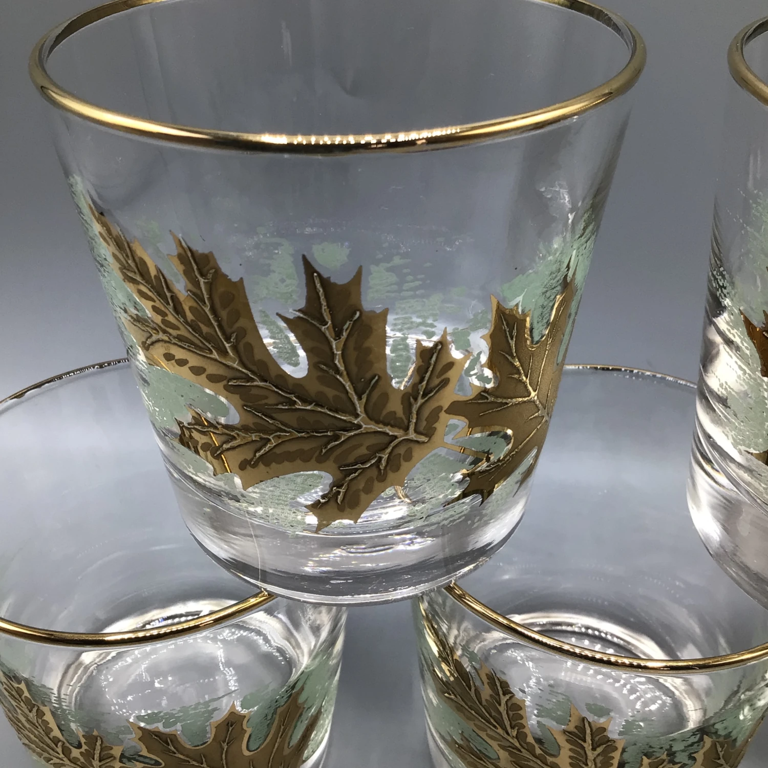 22 kt gold oak leaf old fashion glasses with the Libbey mark on the bottom. The 22kt oak leaves are raised and appear to be done in 3 layers. A very classy Mid-Century Modern low ball glasses.
