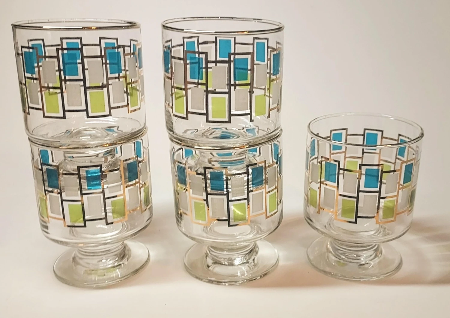 This set of gorgeous water goblets have a modernistic stained glass effect trimmed in flawless gold. I have other pieces of this set listed seperately in my chairish store. Please note that this is the wine goblet and check out the pictures to note size.
